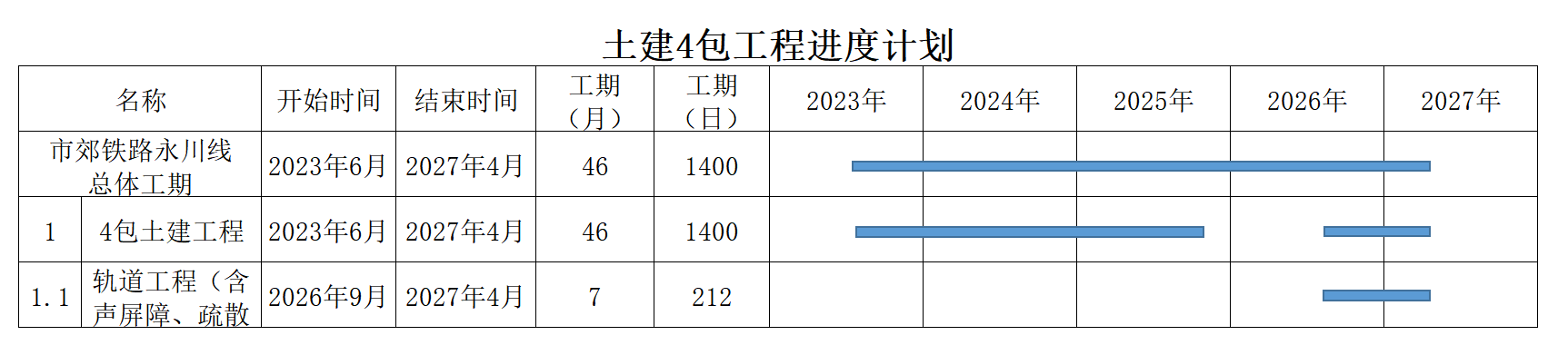 市郊铁路重庆中心城区至永川线工程计划施工总工期60个月。本招标项目计划于2023年6月30日开工,计划1400日历天按合同约定实施和完成本承包工程。
