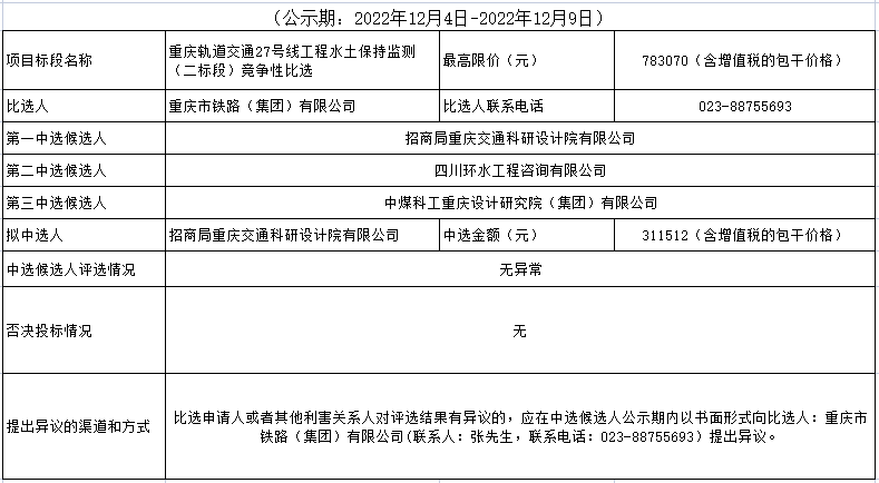 台湾av女优 27号线工程水土保持监测(二标段)竞争性比选结果公示表