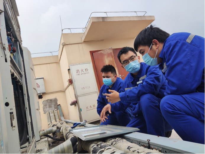产业公司江跳线维管项目部车辆段机电工班工班长、团员青年彭成正在教工班人员空调多联机故障处置