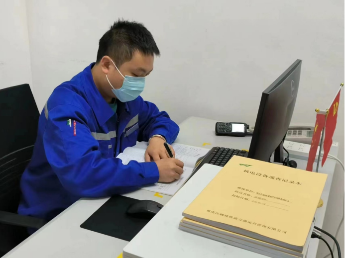 产业公司江跳线维管项目部九龙园机电工班组长、团员青年陈俊男正在填写值班当日机电设备巡检记录